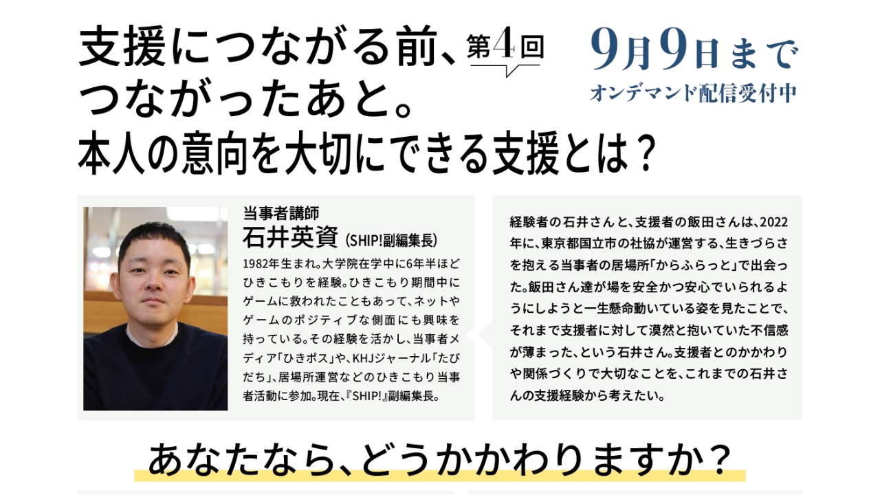 ひきこもり当事者・経験者の講師を招き、各テーマに即したハンドブック事例を読み解き、ゲストとの対話・質疑応答を行います。対話ゲストには、当事者との信頼関係を築き、実践を重ねている支援者をお招きして、一緒に対話を行います。支援現場での当事者との関係づくり、実践のヒントをぜひ持ち帰ってください。(全10回シリーズ)